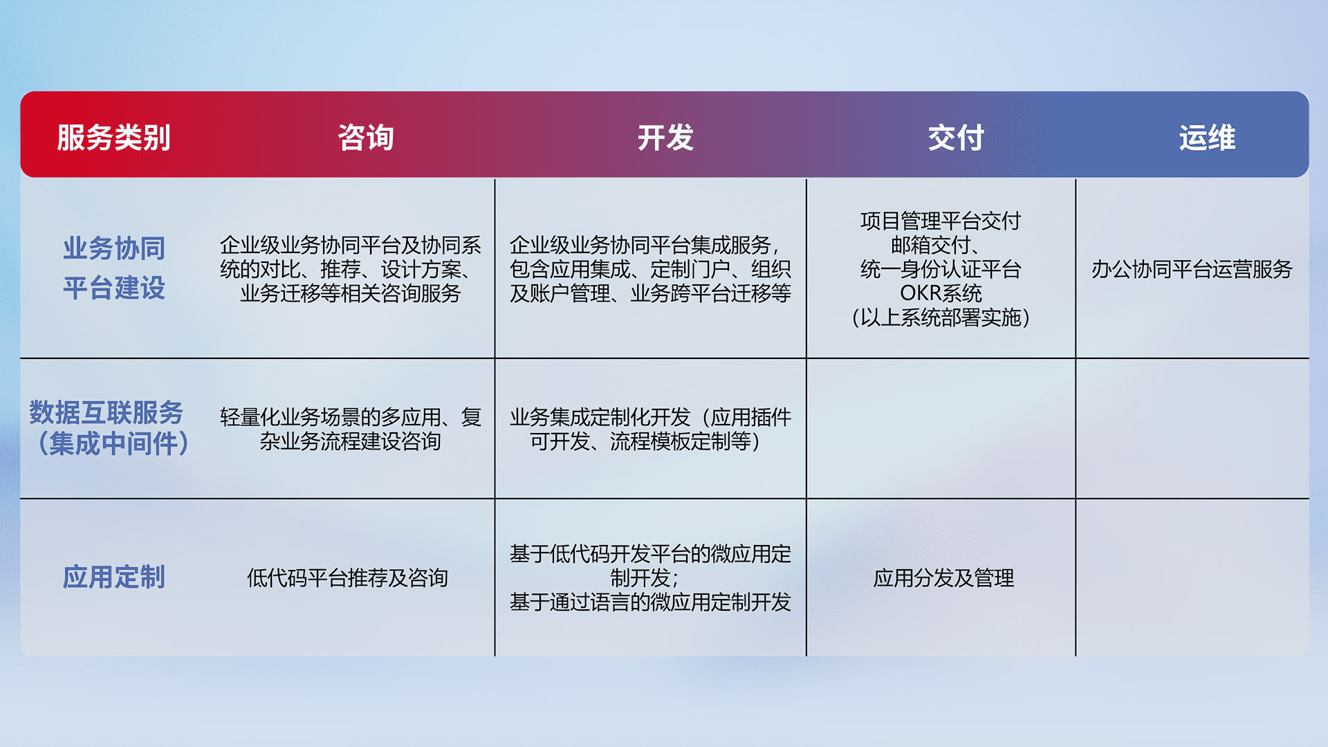 针对钉钉、、企微、、、IDaas等平台级产品提供产品的规划、、、、方案、、交付、、、、定制化开发等服务,,,实现如统一协同办公、、、、智能客户服务、、混合会议管理、、、、智能数据查询、、、、等业务场景,,,,实现数字化转型。。。。