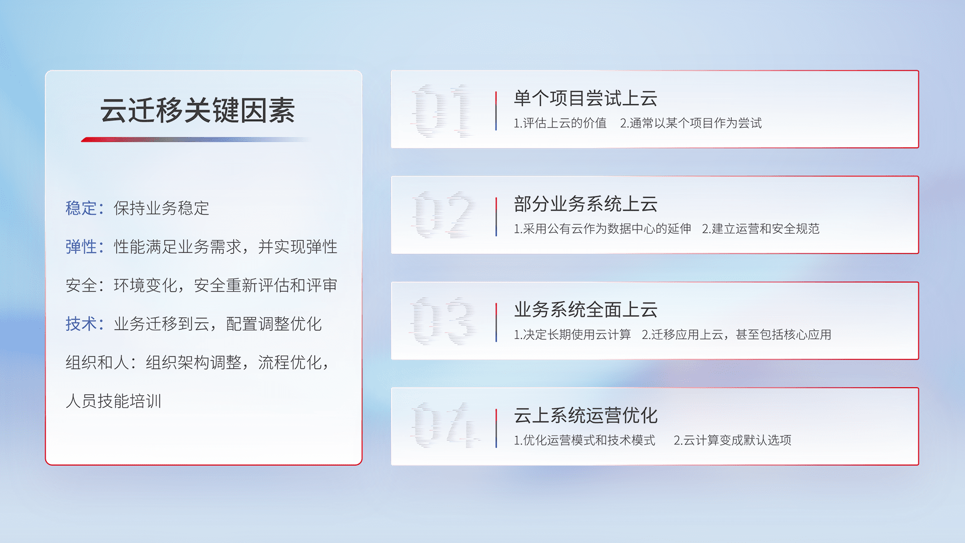 结合实际业务,,,,从规划设计、、、云平台选型、、云原生改造、、数据迁移、、、集成交付,,迁移全过程为客户识别最佳上云路径,,做好风险识别管理,,,设计网络架构、、、身份权限、、、安全审计合规、、、操作审计、、、日志审计、、、监控告警策略、、、、多站点容灾设计等,,,,对云上基础设施进行整体规划,,,,提升IT治理水平,,,,以满足弹性、、、高可用、、、高性能的需求。。。