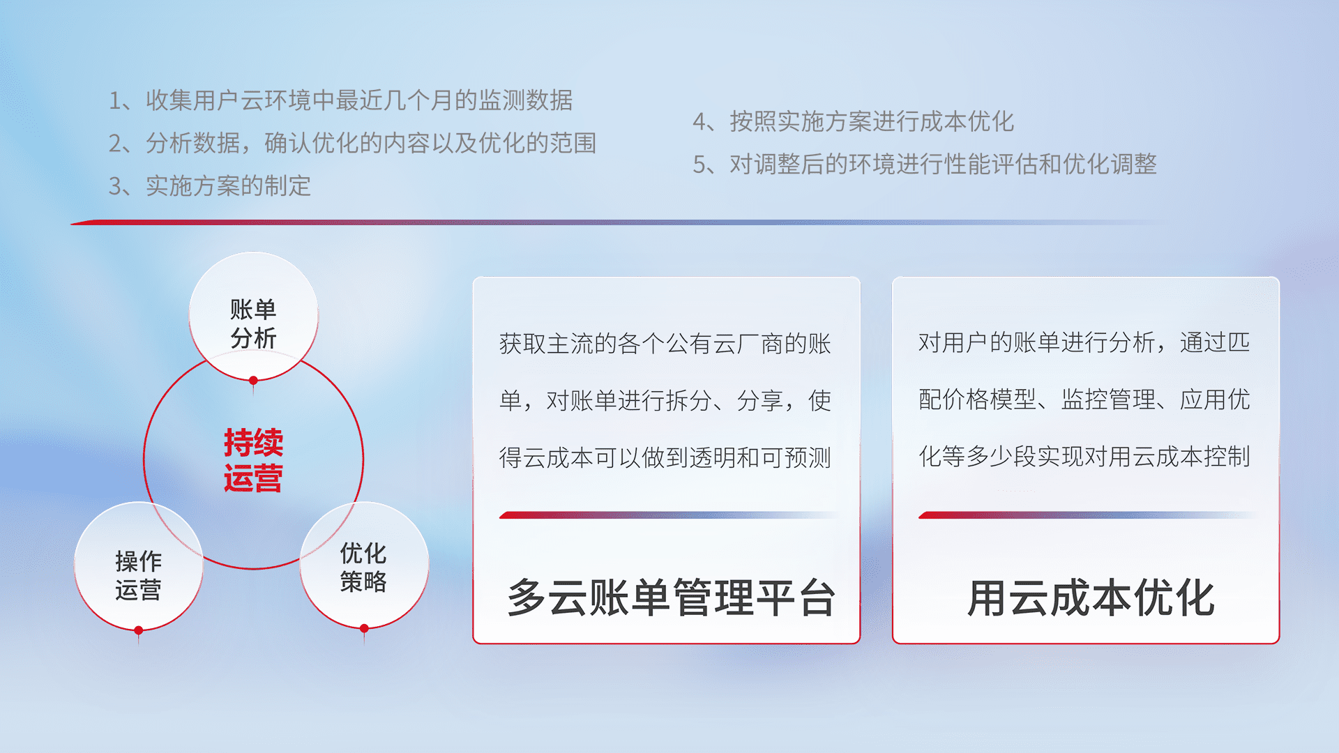 通过多云纳管,,,以统一的资源数据模型把客户的云资源进行抽象和封装,,,进而实现对多云资源的统一操作,,,,保障云资源管理的可靠性、、稳定性与可用性。。。量身定制化运维内容,,,配置、、开发运维、、、、补丁管理、、、备份、、、监控、、、认证和访问管理、、、审计和日常巡检等,,保障在用云过程中的可靠度,,,稳定度以及高可用率。。。